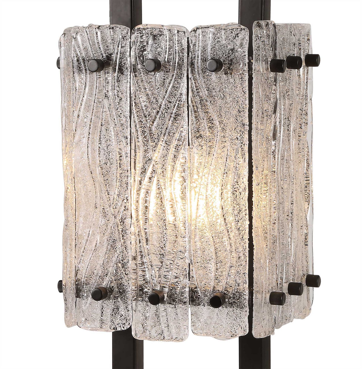 Sarin is another ingeniously invented decorative concept across a comprehensive range of pendants with matching wall, table and floor lamp. Rectangular pieces of glass with a crystallised frosted pattern are held onto the frames with black caps to match the colour of the frame. The fixings are positioned at either end of the glass so the theme appears as a reimagined xylophone. These unique features add a dramatic statement to their given setting.