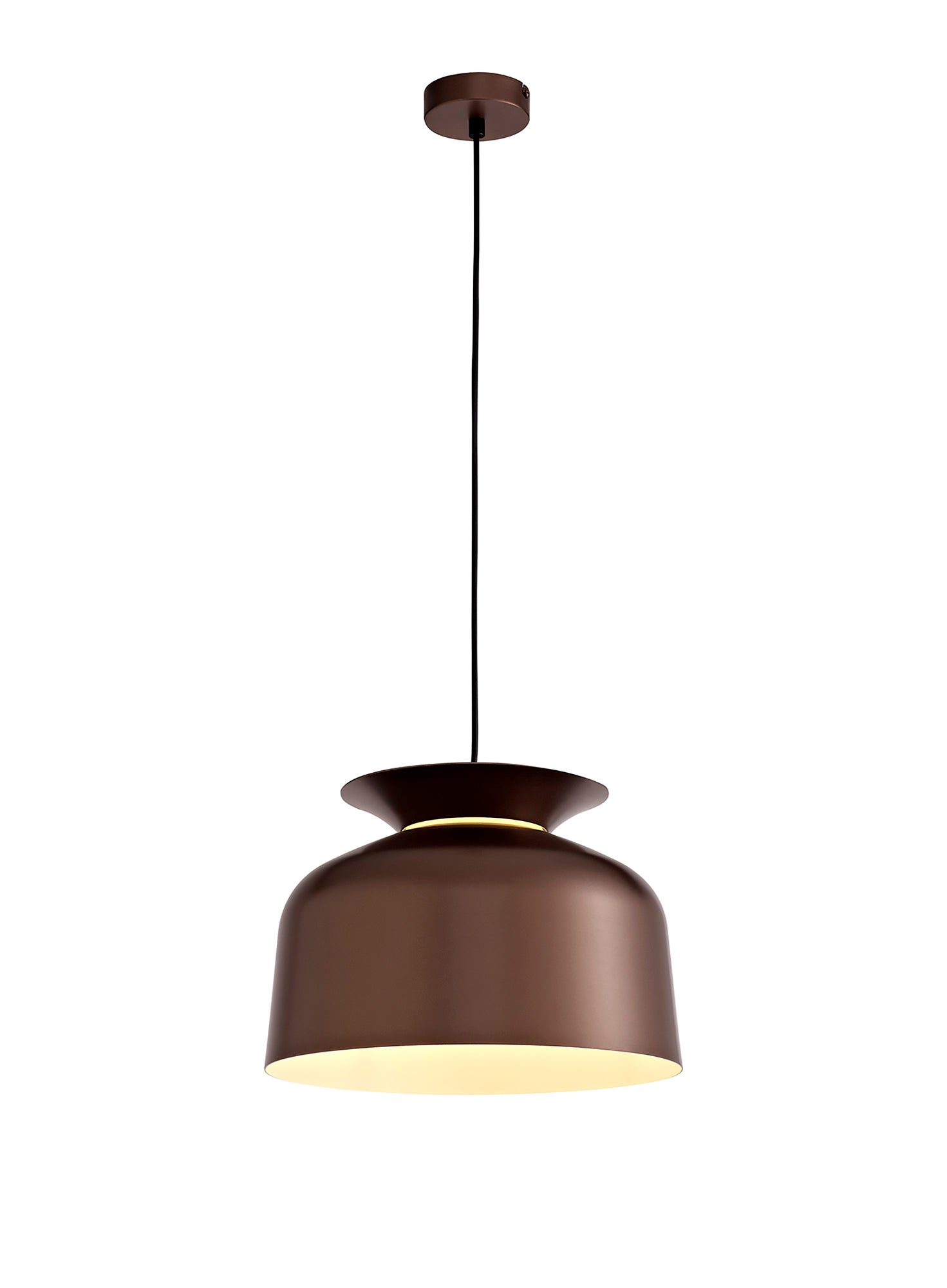 Talitha is a collection of single pendants, the frames are formed from a larger dome shape and a shallow dish both positioned in different directions to outline the shape of a serving bowl. The slim diffuser where each piece meets has been added to give a soft halo of light in-between both shapes projected from the E27 lampholder which dispels the main source of light from the larger open shade.
