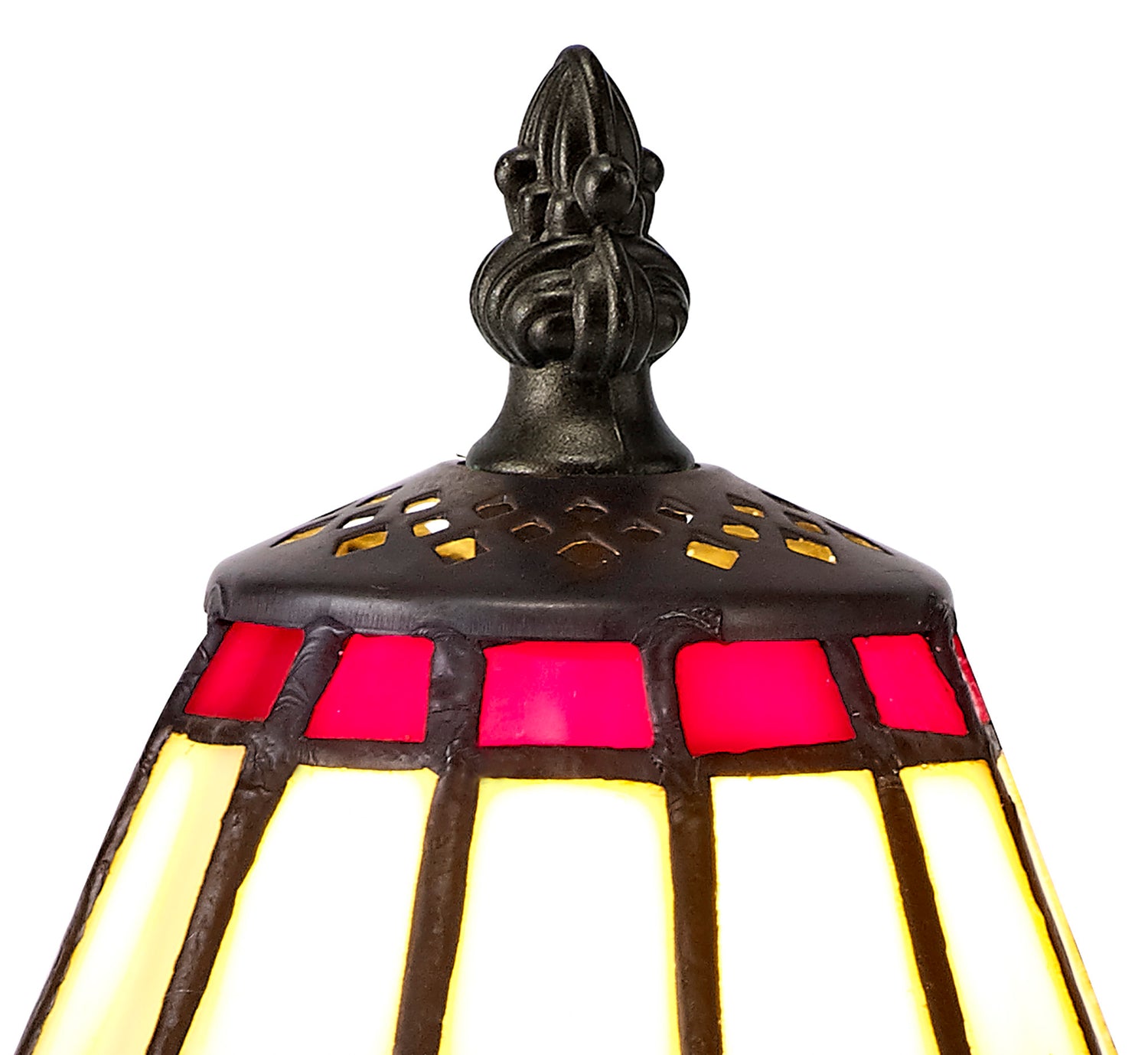 Uklun uses a traditional Tiffany shade but with a modern twist. The fanned feather shapes forming the umbrella glass is mostly cream coloured with the curved tips of each point available in either green, brown, red, purple or grey. The modern component takes the form of small clear crystal pieces fixed on alternating points of the shades rim furthering the ranges regal appeal.