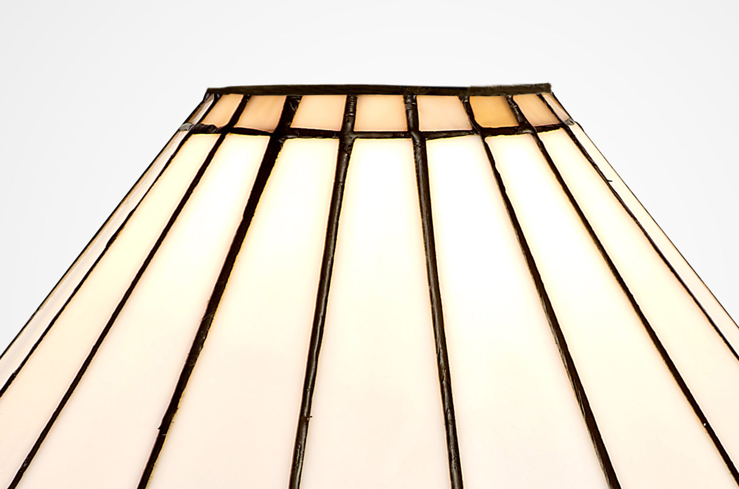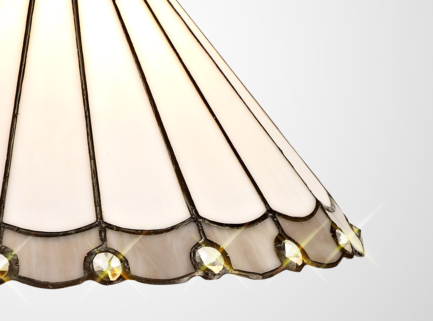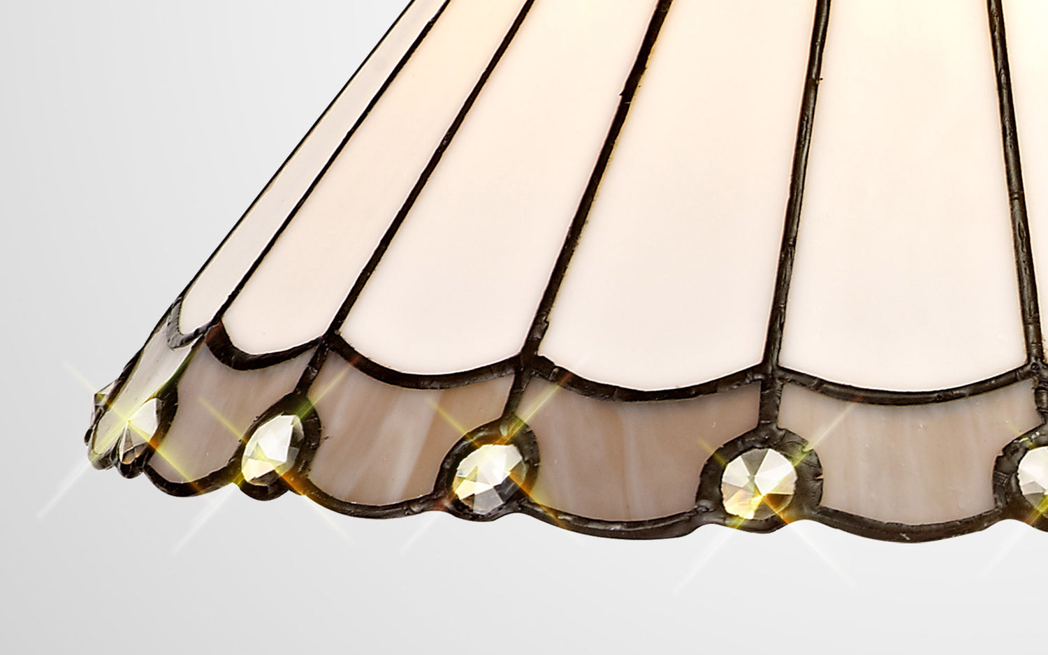 Uklun uses a traditional Tiffany shade but with a modern twist. The fanned feather shapes forming the umbrella glass is mostly cream coloured with the curved tips of each point available in either green, brown, red, purple or grey. The modern component takes the form of small clear crystal pieces fixed on alternating points of the shades rim furthering the ranges regal appeal.