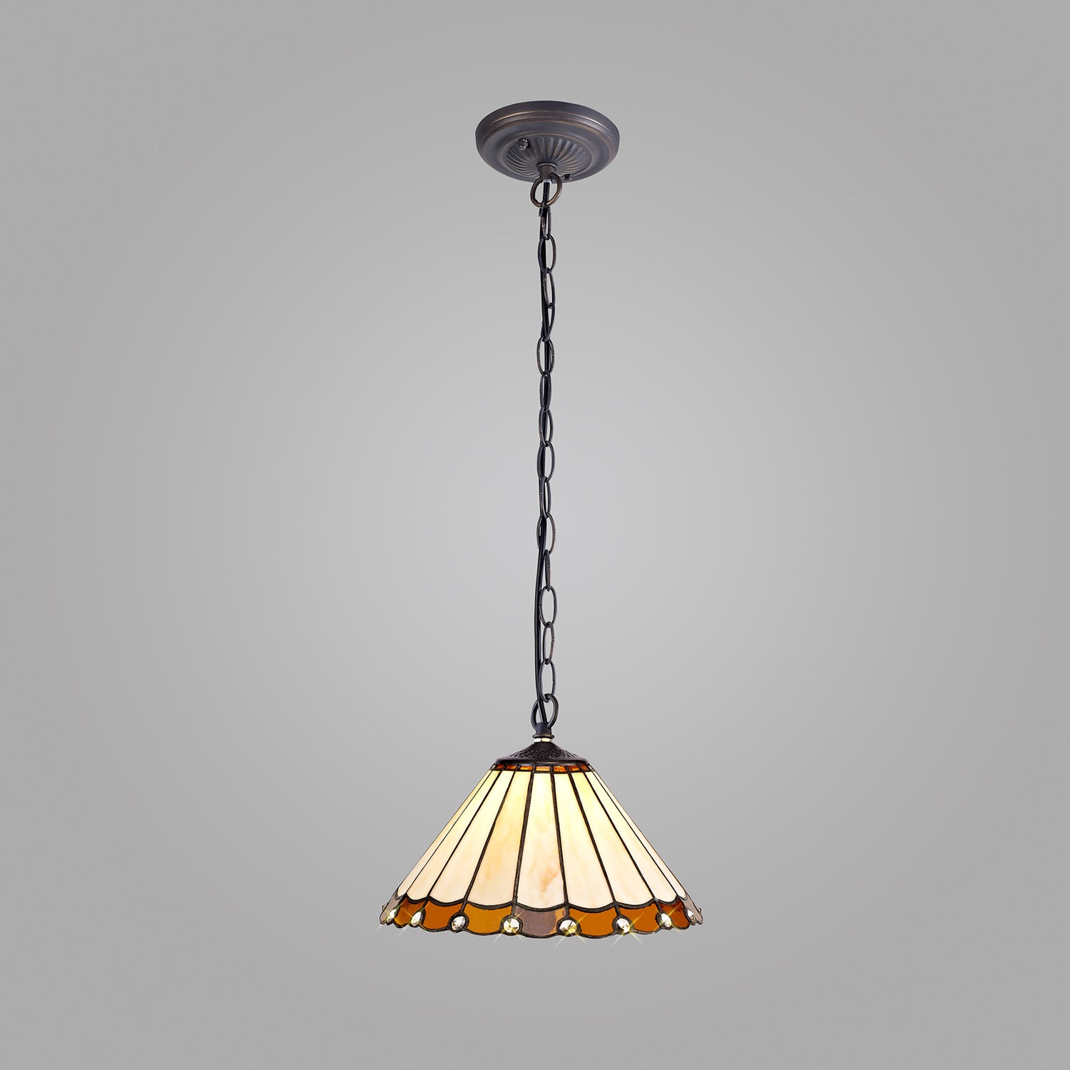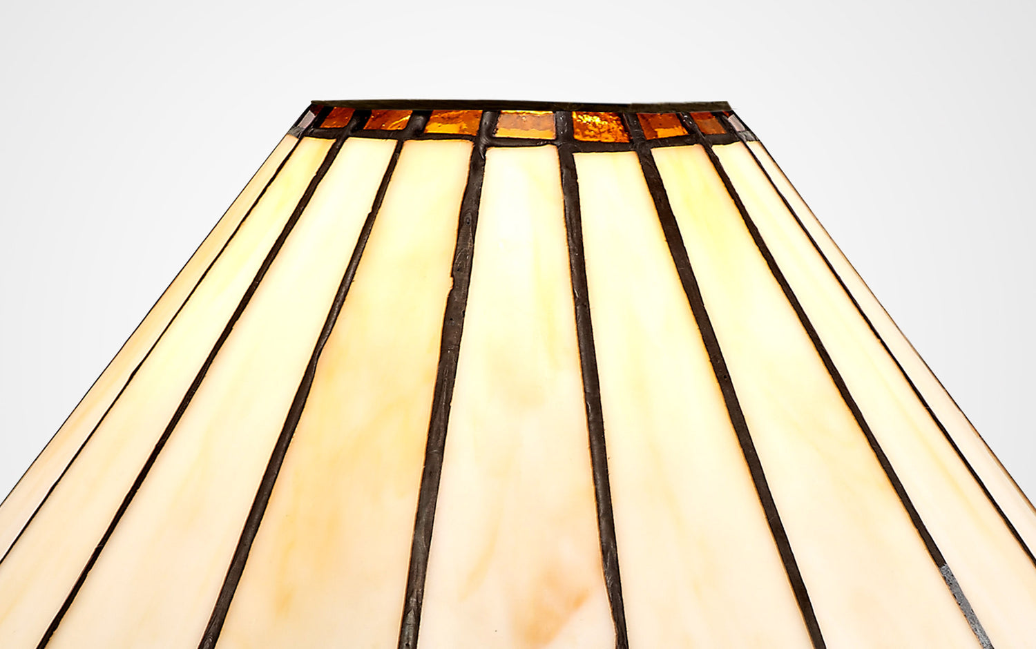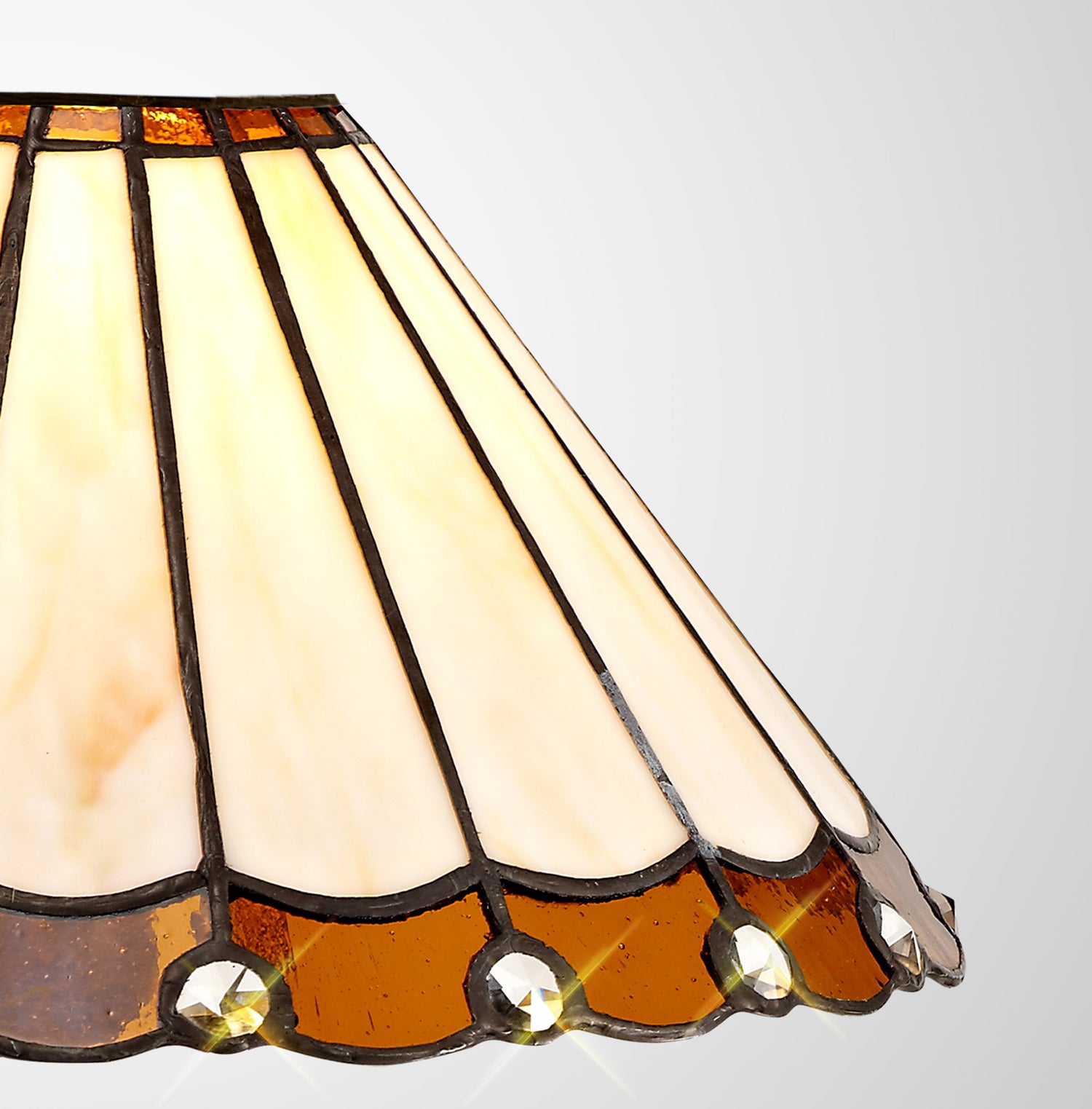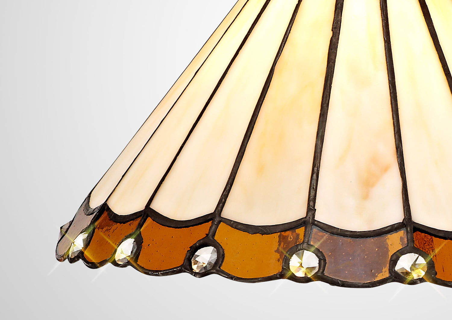 Uklun uses a traditional Tiffany shade but with a modern twist. The fanned feather shapes forming the umbrella glass is mostly cream coloured with the curved tips of each point available in either green, brown, red, blue or grey. The modern component takes the form of small clear crystal pieces fixed on alternating points of the shades rim furthering the ranges regal appeal.