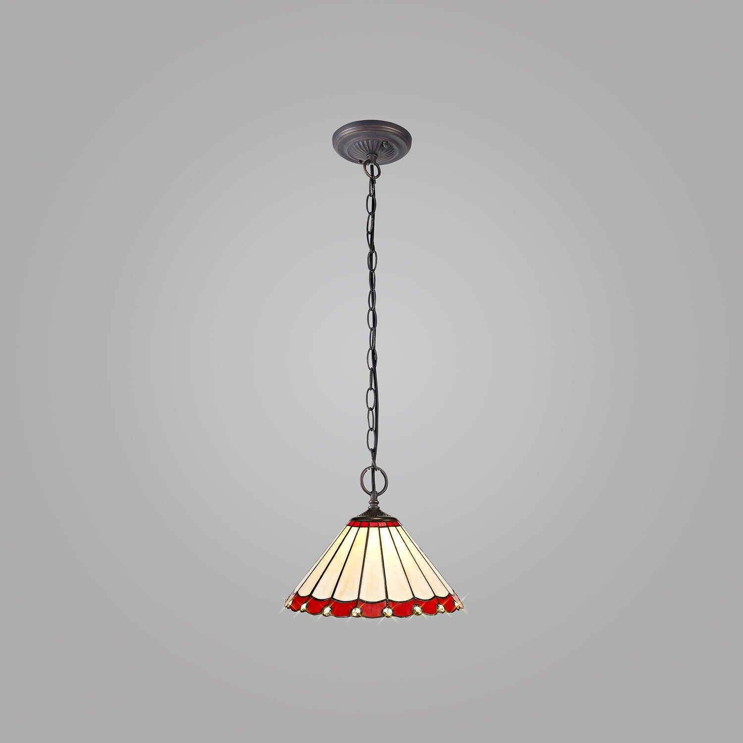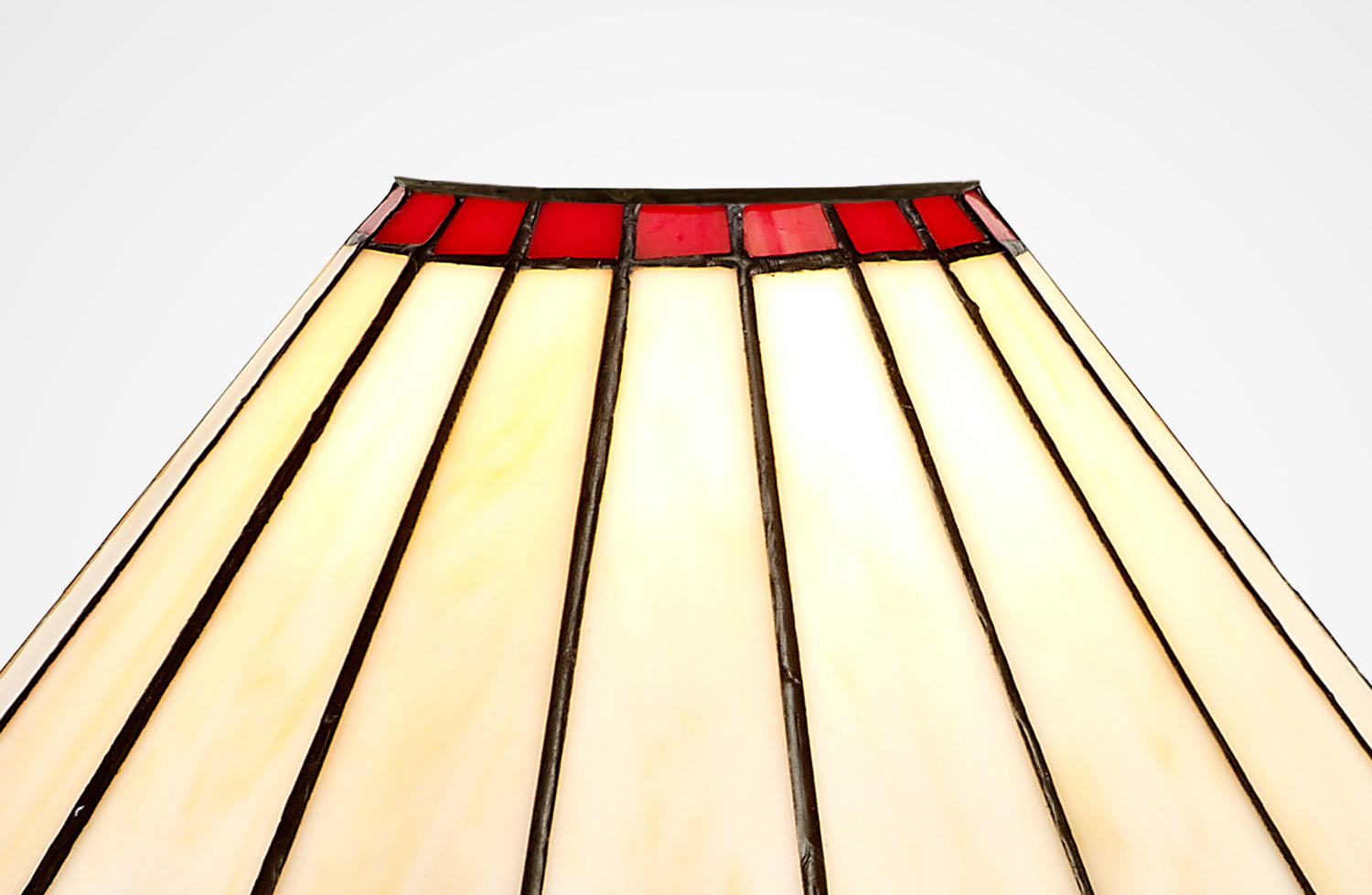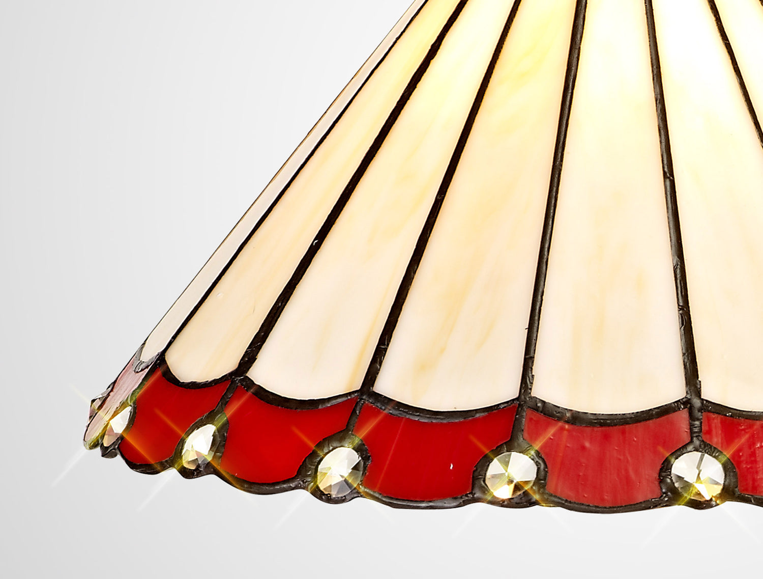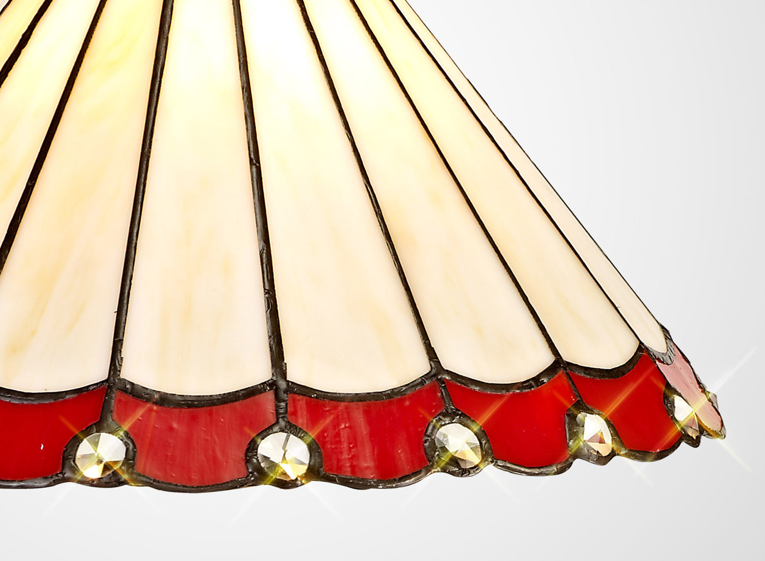 Uklun uses a traditional Tiffany shade but with a modern twist. The fanned feather shapes forming the umbrella glass is mostly cream coloured with the curved tips of each point available in either green, brown, red, purple or grey. The modern component takes the form of small clear crystal pieces fixed on alternating points of the shades rim furthering the ranges regal appeal.
